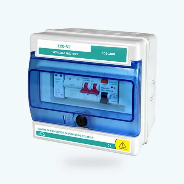 El cuadro de mando y protección diseñado para la recarga de vehículos eléctricos ofrece una solución robusta y fiable con 2 polos de 40A a 230VAC, incorporando protección contra sobretensiones transitorias de 15kA y protección permanente. Incluye un diferencial de tipo A y cerradura con llave, garantizando una operación segura y controlada en entornos residenciales o comerciales. Ideal para instalaciones que requieren una protección avanzada frente a sobrecargas, picos de tensión y accesos no autorizados, este sistema asegura una carga eficiente y segura para sus vehículos eléctricos.
